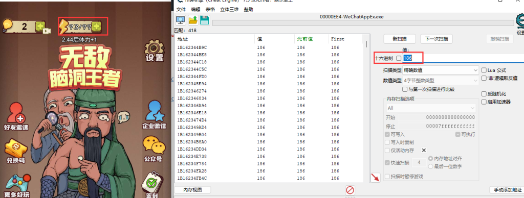 此处以体力变化为例讲解,对应的提示钥匙同理。此时体力93点,由于我的64位电脑*2,所以搜索186。